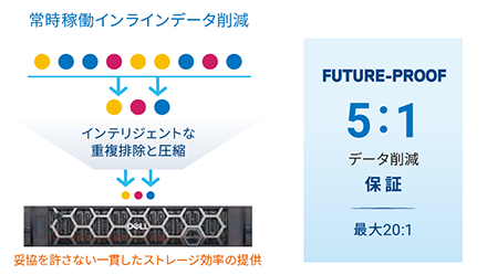 仮想環境でストレージ容量が逼迫する場面では、PowerStoreの5:1データ削減を活用し、重複排除・圧縮で容量を削減。結果としてハード拡張不要でコスト抑制と快適なユーザー体験を両立できます。