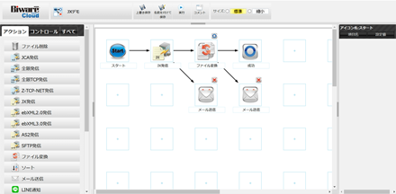 自動処理のルールとなるジョブフロー(ワークフロー)の定義は、アイコンを並べるだけで手軽に作成できます。