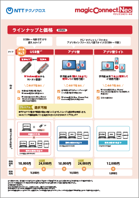 マジックコネクト・ネオの価格や仕様(対応OSなど)をまとめたパンフレットです。