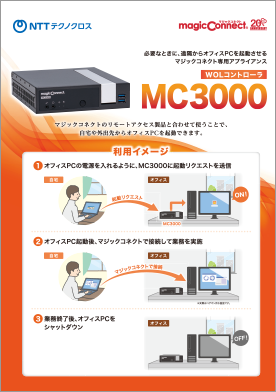 社外からオフィスPCの電源を投入できるWOLコントローラ「MC3000」のパンフレットです。